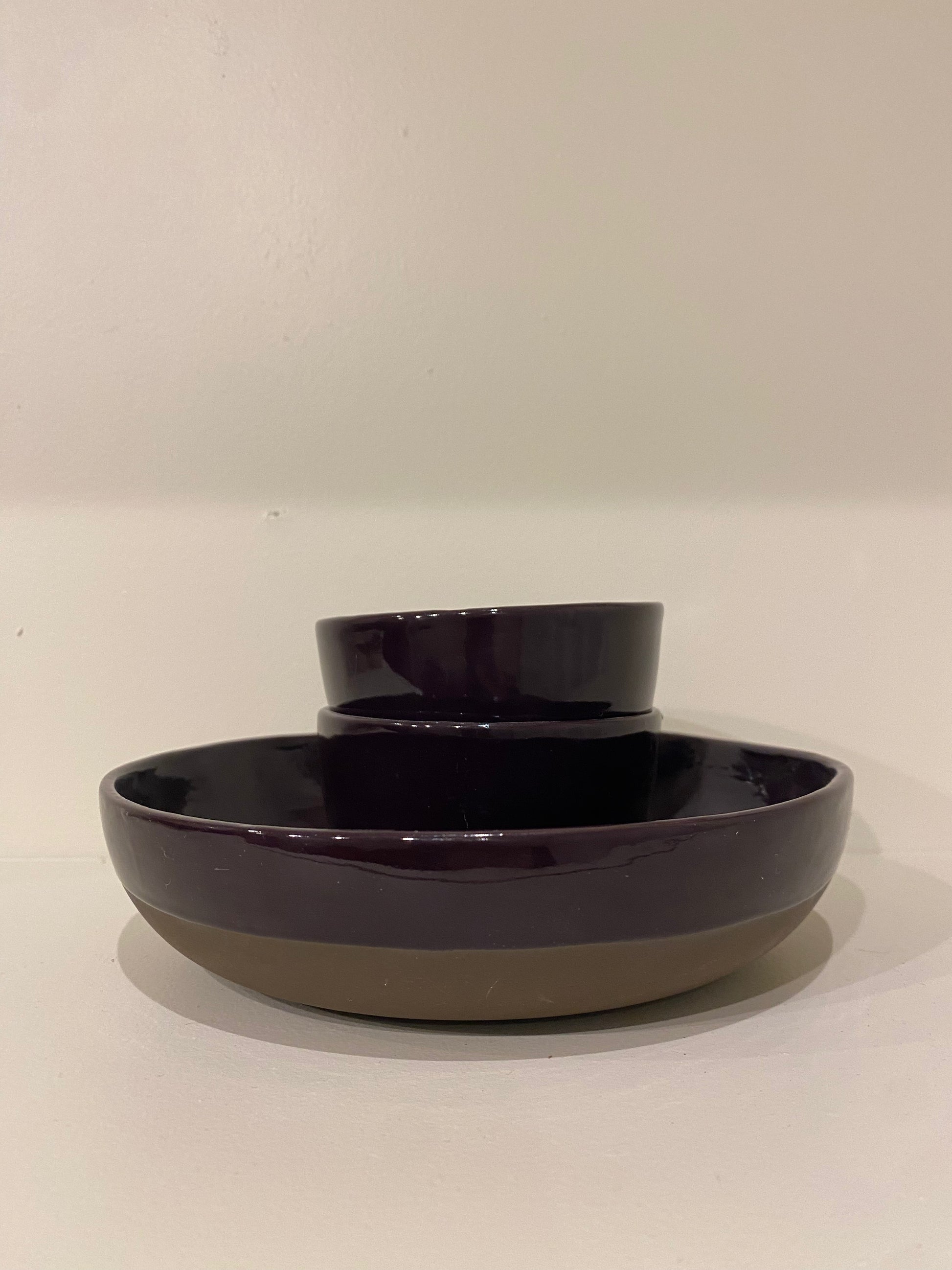 Low bowl in our aubergine colour. Black/dark brown clay base.